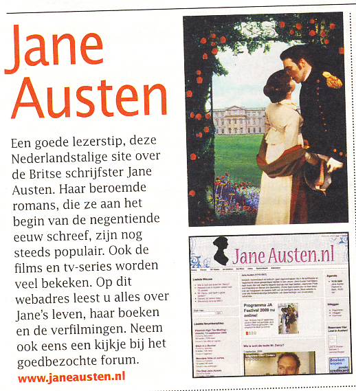 Een enthousiaste bezoekster van deze Jane Austen.nl (en tevens moeder van de sitebeheerder, maar dat terzijde), heeft deze website voorgedragen als ‘leuke site’ bij de Troskompas, de gids van de Tros. Deze week staat daarom een kort artikeltje over Jane Austen én deze Nederlandstalige website in de gids: