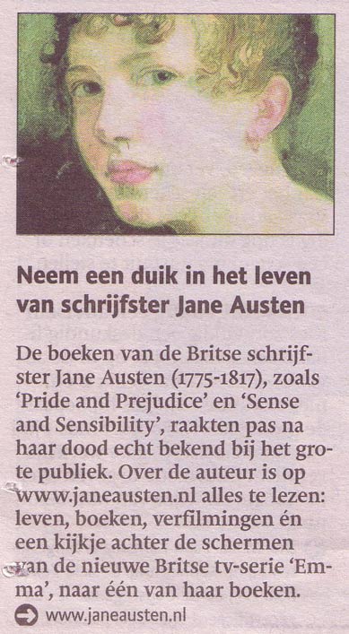 Onder de kop ‘Neem een duik in het leven van schrijfster Jane Austen’ besteedde dagblad De Stentor vandaag aandacht aan Jane Austen én Jane Austen.nl. Lees hier het hele bericht (met grote dank aan forumlid Alfred):